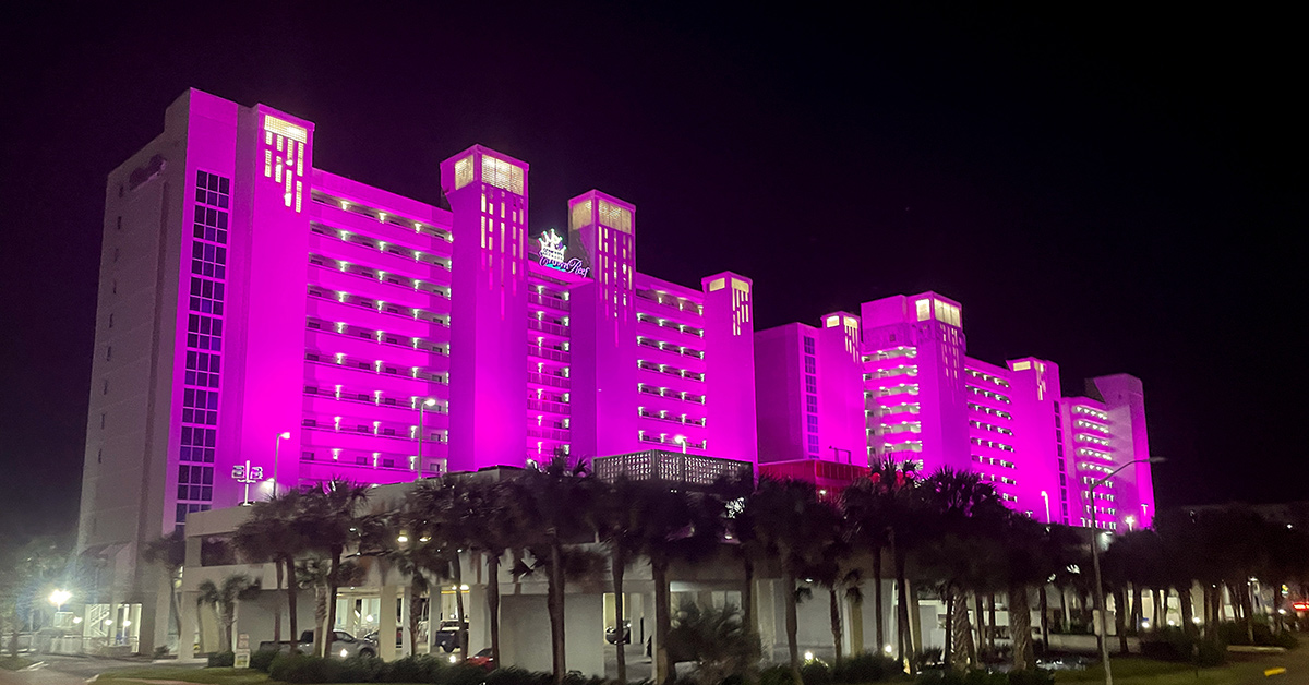 Crown Reef in Myrtle Beach is lit up pink for the month of October.